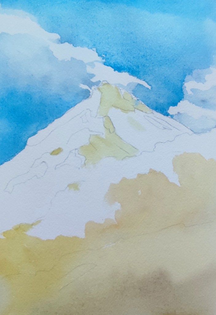 Zerua margotzeko Urdin bizia (Bright blue 509) erabiliko dugu Ultramar urdin (Ultramarine 509) apur batekin nahastuta. Kasu honetan papera lehor dagoela jarri dut kolorea gainean baina aurretik papera ur garbiaz bustita ere egin dezakegu proba. Modu honetara hodeien ertzak ez dira hain zorrotz ikusiko eta ur orbanak gehiago difuminatuko dira. Hodeien azpialdeetan Indigo (516) apur batekin itzalak egiten saiatuko gara.