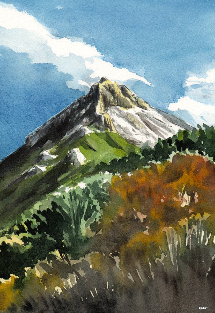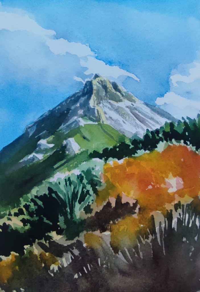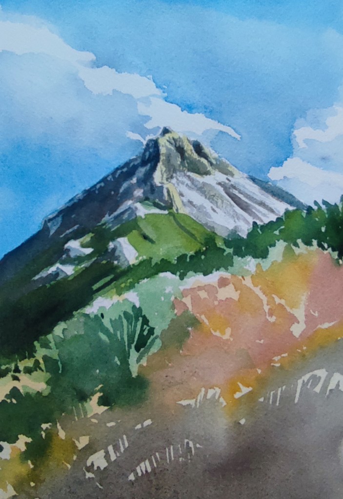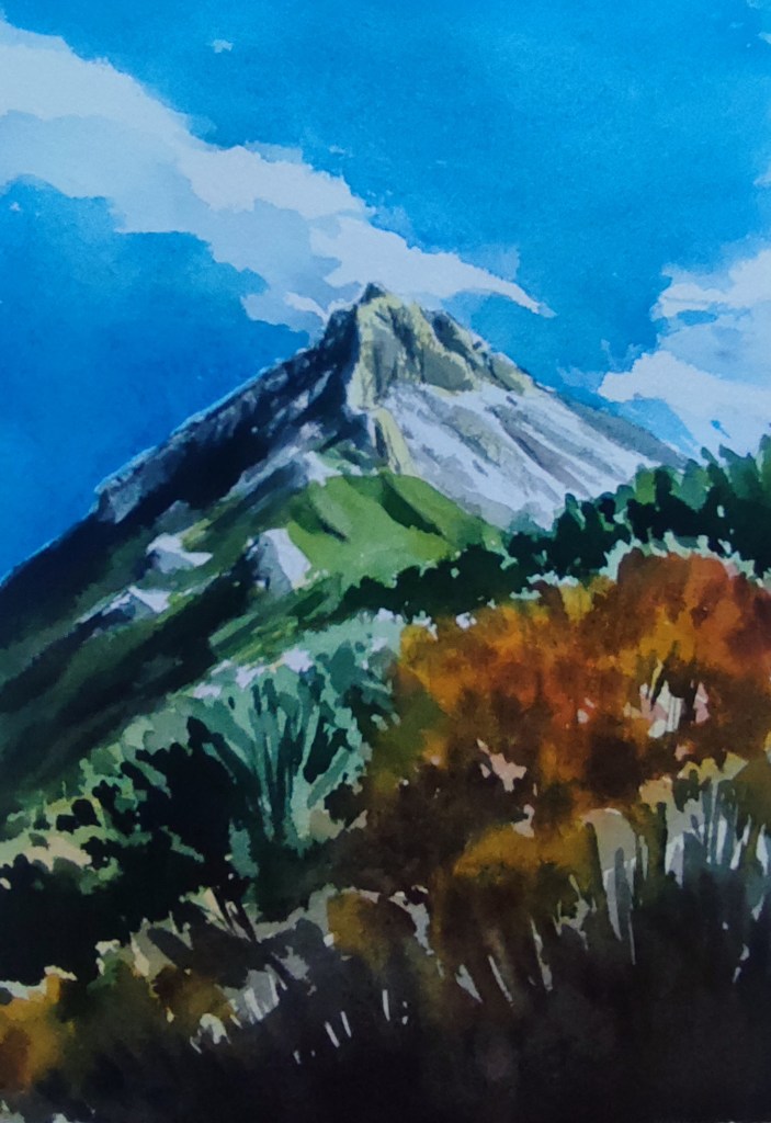 Geruzaz geruza kolore ilunagoak ezarriz joango gara. Une honetan pintzen estuxeago bat erabiltzeko ordua ere izan liteke. Indigoa (516) eta sepia (413) nahastuta mendiaren itzalak ilunduko ditugu tarteka harriak irudikatzeko argiuneak utziz.
