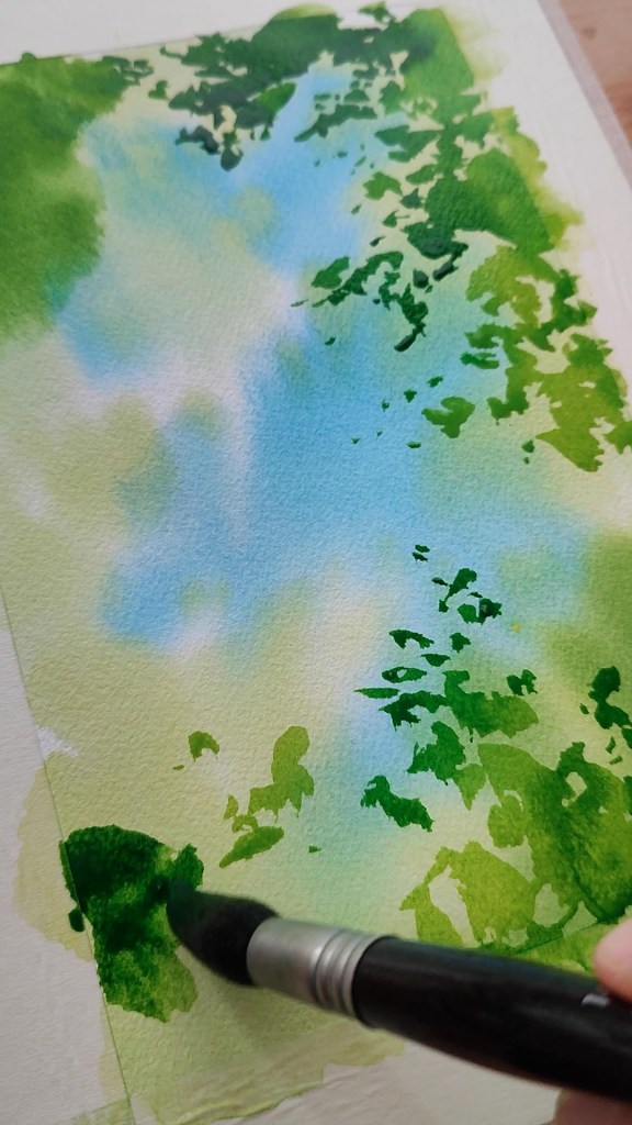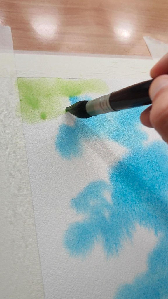 Paperaren hezetasuna aprobetxatuz Zeru Urdina hartu eta orban irregular batzuk margotuko ditugu. Argiune batzuk utzi ditzakegu laino zuri batzuen itxura hartu dezaten. Limoi Horia Maskuri Berde apur batekin nahastu eta kolore berde argi honekin ere orban irregular batzuk egingo ditugu.