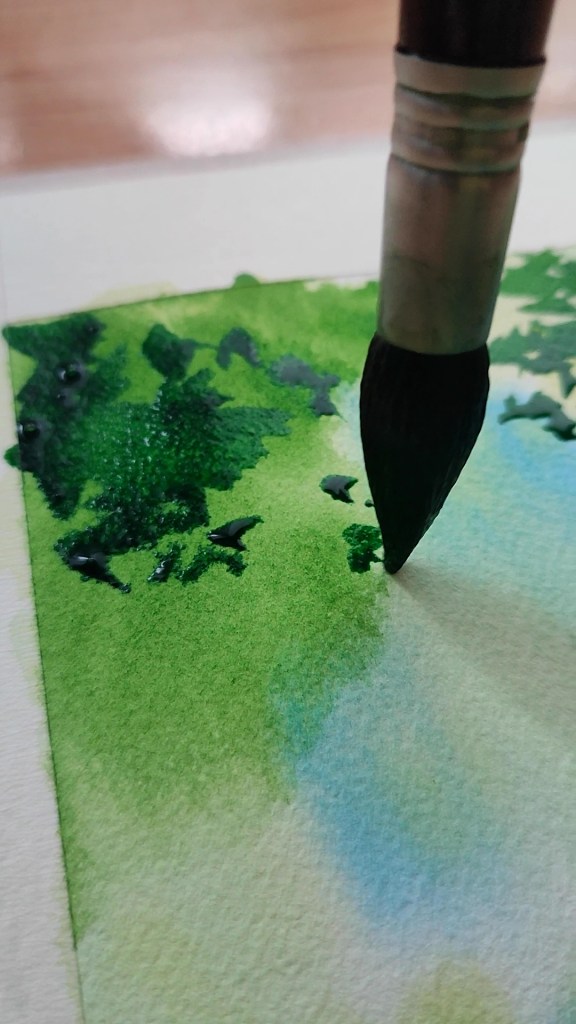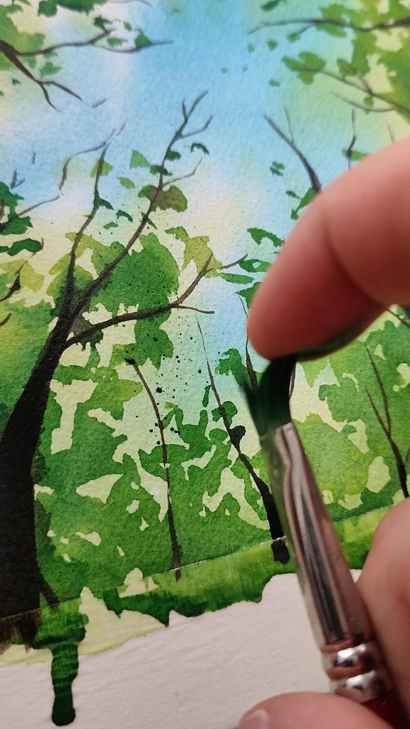 Ile gogor xamarreko pintzel bat edo hortzetako eskuila bat erabilita berde zipriztin txiki batzuk gehituko ditugu marrazkian. Kontu handiz aplikatu behar da teknika hau zipriztinak guk nahi dugun tokian bakarrik gehitzeko.
