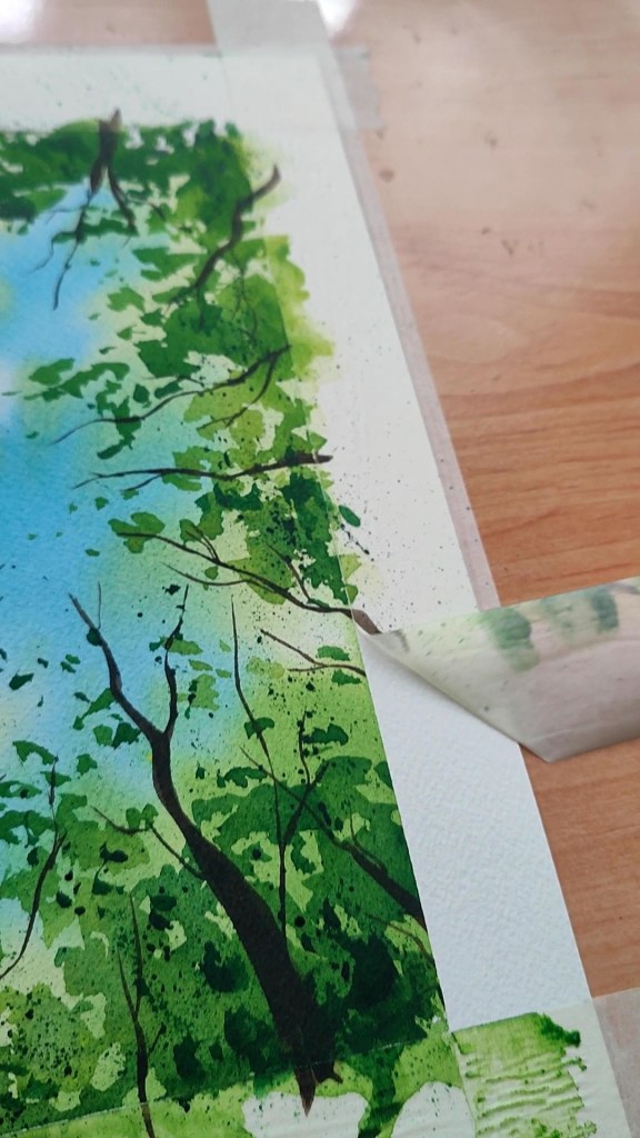 Papera apur bat lehortu dadin itxarongo dugu baina guztiz lehortu dadin utzi gabe. Ile lehorgailu bat ere erabili dezakegu prozesua azkartzeko. Papera prest dugunean hezetasun distira lauso bat izango du baina ez da urik geldituko gainazalean. Une horretan Maskuri berdearekin zuhaitzetako hostoen orbanak marrazten hasiko gara. Orbanak irregularrak egitea komeni da eta horretarako pintzelaren punta nahiz gorputz guztia erabili ditzakegu txandaka.