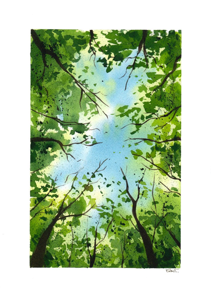 Lehortzen utziko dugu apur batean baina, lehen ere egin bezala, papera guztiz lehortzen utzi gabe. Puntu horretara heltzen denean, pintzel fin baten laguntzaz enborrak margotzen hasiko gara. Enborren norabide orokorra paperaren ertzetatik erdi ingurura gerturatzekoa izango da perspektibak hala agintzen duelako. Enborren kolorerako Siena Lur Naturala, Sepia eta Indigo Urdin apur bat erabili ditut nik. Enborrak marraztean ez egin enbor zuzenegiak, margotu adar okerren batzuk ere. Gogoratu enborra zenbat eta gorago joan orduan eta finago ikusiko dugula. Beraz, paperaren erdi inguruko arramak oso fin marraztu beharko ditugu.