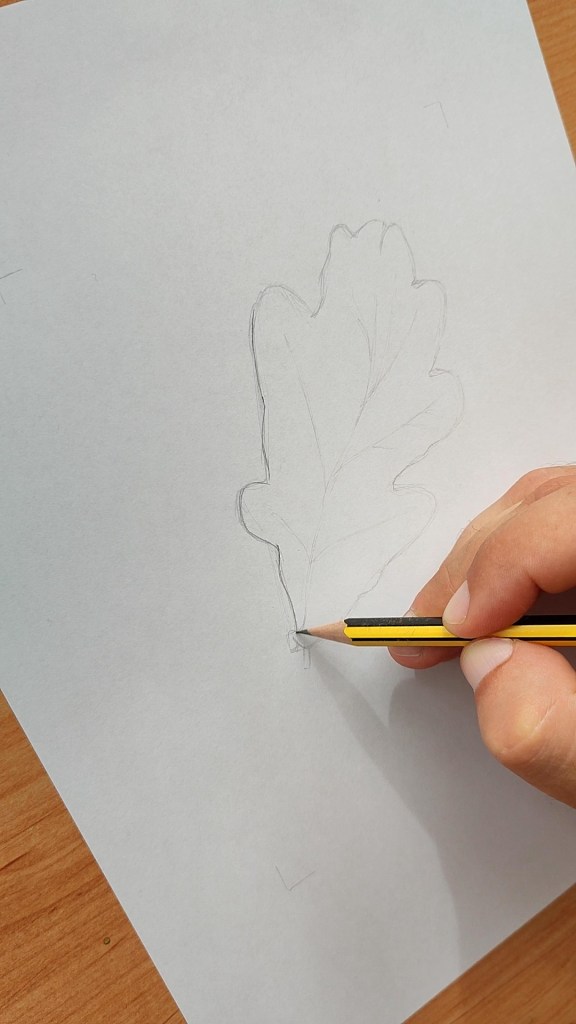 Lehenengo, folio arrun batean marraztuko dugu hostoa. Akuarela paperera pasatzean zer neurritako marrazkia nahiko dugun kalkulatuko dugu lehenengo. Muga horiek paperean markatuta dauzkagula marrazkiarekin hasiko gara. Mina gogorreko (2h) arkatz batekin hasi ohi naiz ni marrazten eta gero, mina bigunagoko arkatz arrunt batekin (HB) errepasatu.