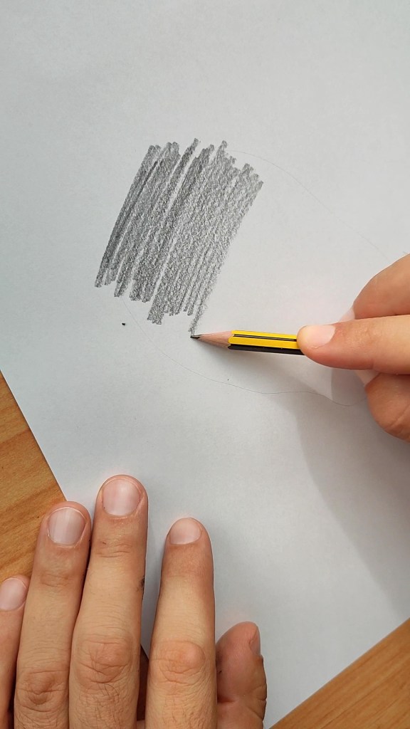 Folioaren atzeko aldea arkatzez zirriborratuko dugu gero, marrazkia, akuarela paperera kalkatu ahal izateko. Teknika honetan garrantzia duena marrazkiaren atzeko aldean grafito kapa bat ezartzea da. Kalkatzeko orriak ere erabili ditzakegu baina bestela proposatutako teknika honekin ere egin dezakegu aurrera.