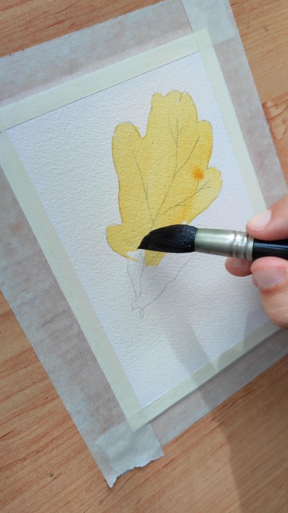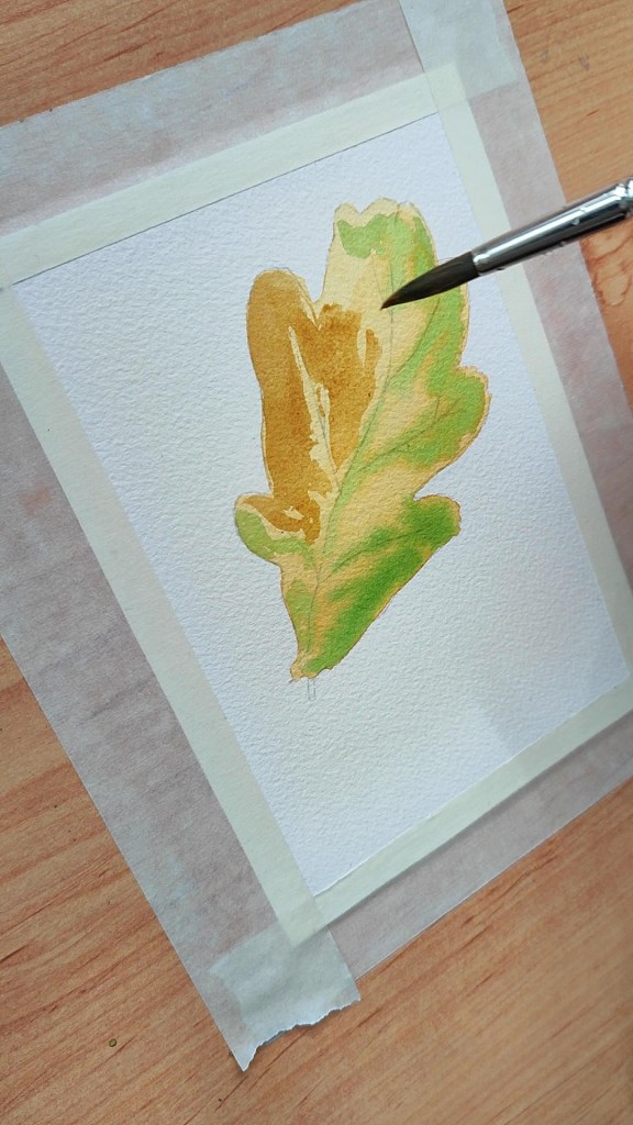 Ohi bezala kolore argienekin hasiko gara margotze. Kasu honetan Urre indiarra (244) kolorea erabili dut hostoa hartzen hasia den urre kolore hori emateko. Punta fineko pintzel lodiarekin errazago betetzen da lehenengo kapa modu uniformean. Horrela, pintzela pigmentuz eta urez ondo kargatuta azalera handiak margotu ahal izango ditugu detaileetako zorroztasunik galdu gabe.