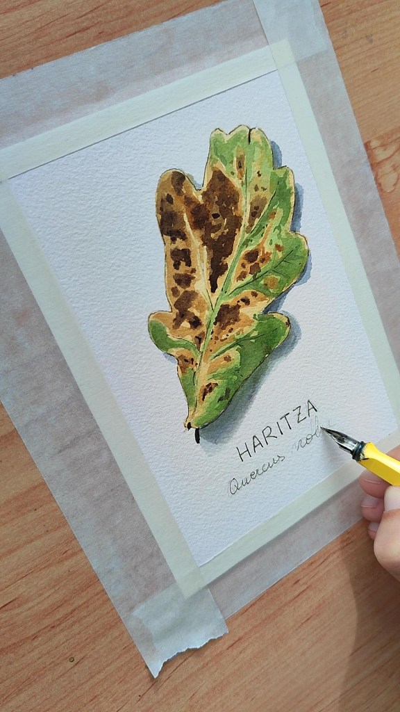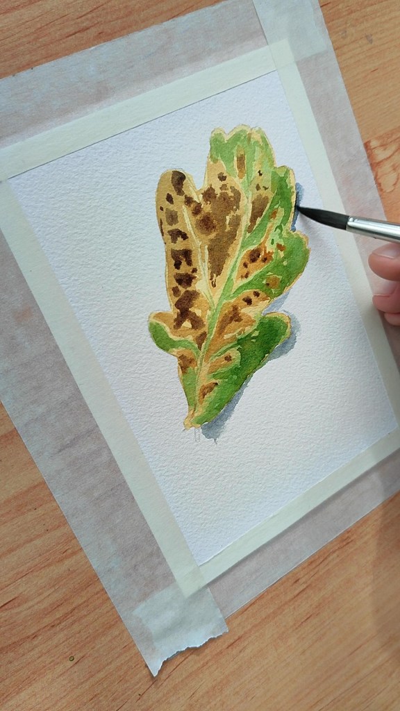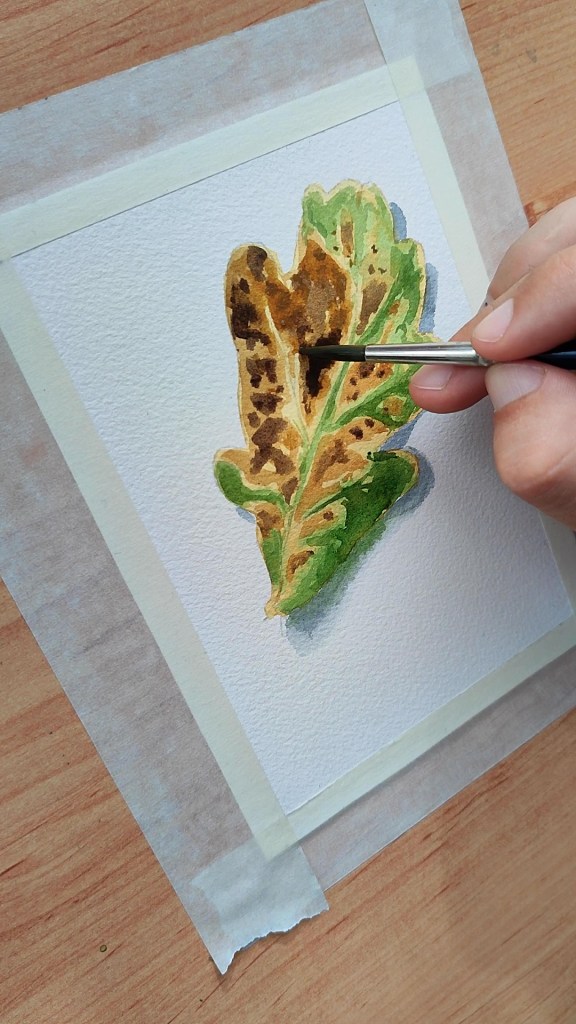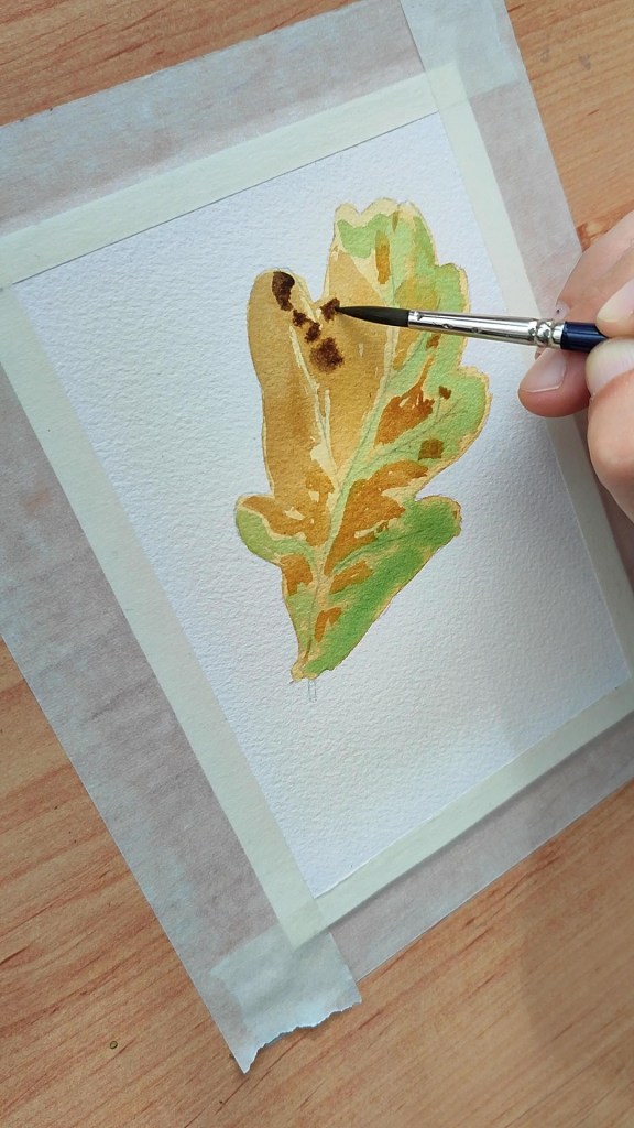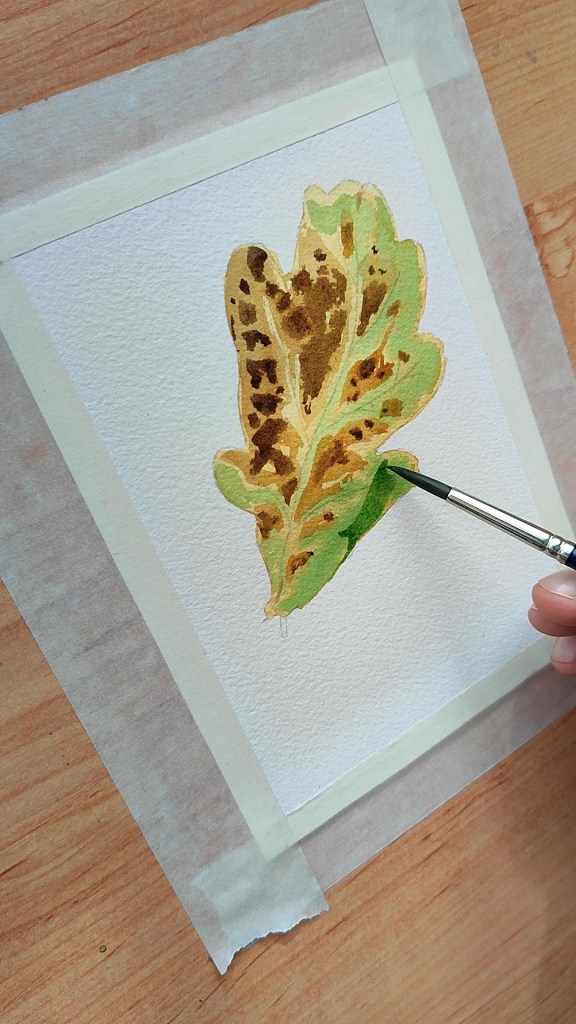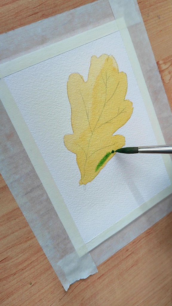 Hartutako hostoa ez da guztiz horituta egon eta berde ukitu batzuk ere badauzka oraindik. Maskuri berdea (716) aukeratu dut pintzel finago batekin orban txikiagoak egiteko. Pausu hau aurreko orban horia guztiz lehortu gabe dagoela egingo dugu bi orbanen arteko ertza apur bat difuminatu dadin.