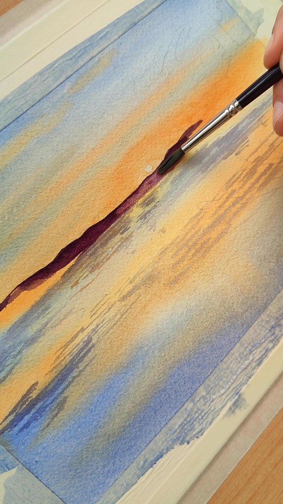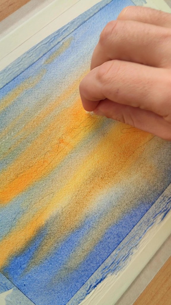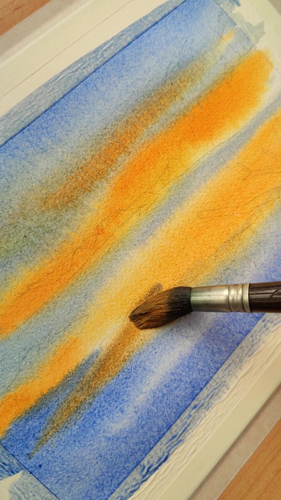 Margotzen hasi aurretik, papera, ur garbiz bustiko dugu. Honela lortuko dugu margotzean, kolore orbanak lausotzea eta elkarren artean nahastea. Ohi dugun moduan kolore argienetik hasiko gara margotzen. Kasu honetan Indiako Urrea (244) hautatu dut zeruko tonu hori horiek margotzeko.