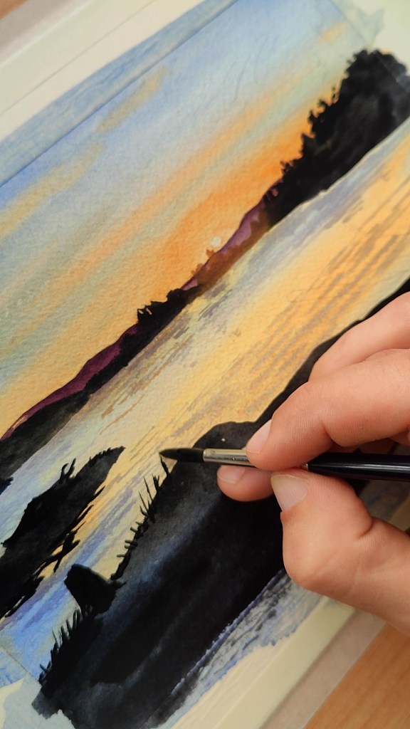 Itsasoz haraindiko urdina (511) eta Bioleta (607) nahastuta, pintzel fin batekin, lakuko uretako olatuen itzalak margotzen hasiko gara. Gugandik gertuago dauden orbanak biziago margotuko ditugu, ilunago, eta urrun daudenak, aldiz, argiago. Pintzelarekin kolorea hartzen dugunean zenbat ur hartzen dugun neurtuta lortzen dira matizazio horiek. Zenbat eta ur gehiago orduan eta kolore argiagoa aterako zaigu.