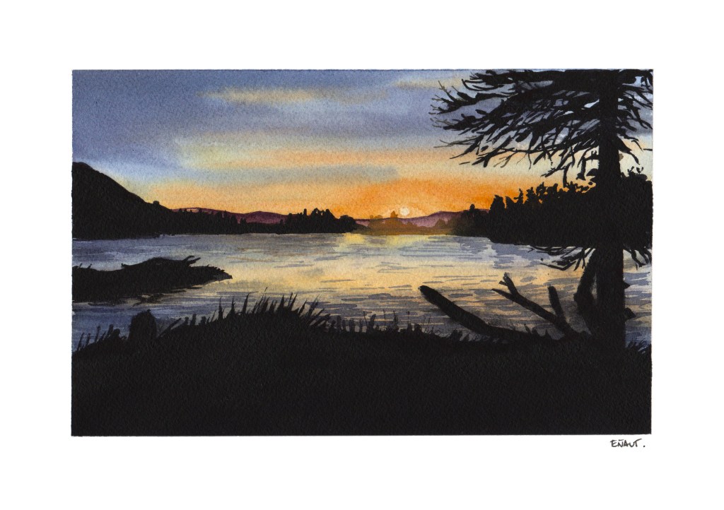 Lan hau amaituta, berriz errepasatu ditut lehenengo planoko detaileak eta itzal gehiago margotu ditut lakuko uretan Itsasoz haraindiko urdina (511), Indigo urdina (516) eta Bioleta (607) nahastuta.